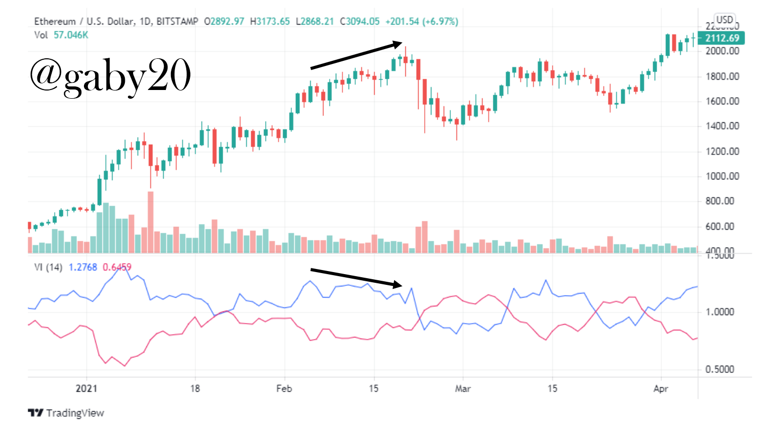 En este gráfico de la moneda Ethereum podemos observar una divergencia bajista por lo que es un buen momento para vender, si vemos el grafico del precio, este sigue aumentando un poco más pero luego cae considerablemente. El indicador de vórtice advirtió antes de que esto sucediera.