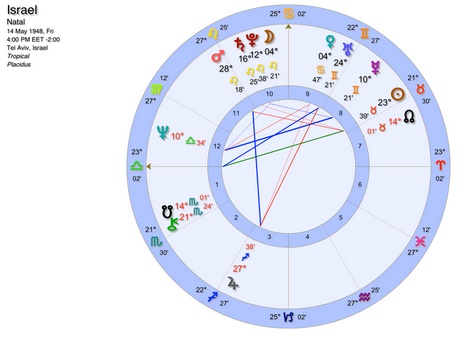 In particular, as Pluto goes through Israel's fourth house, in a couple of years it will oppose Israel's moon (the people), and then Israel's Pluto. These will be stressful and transformatie events.
