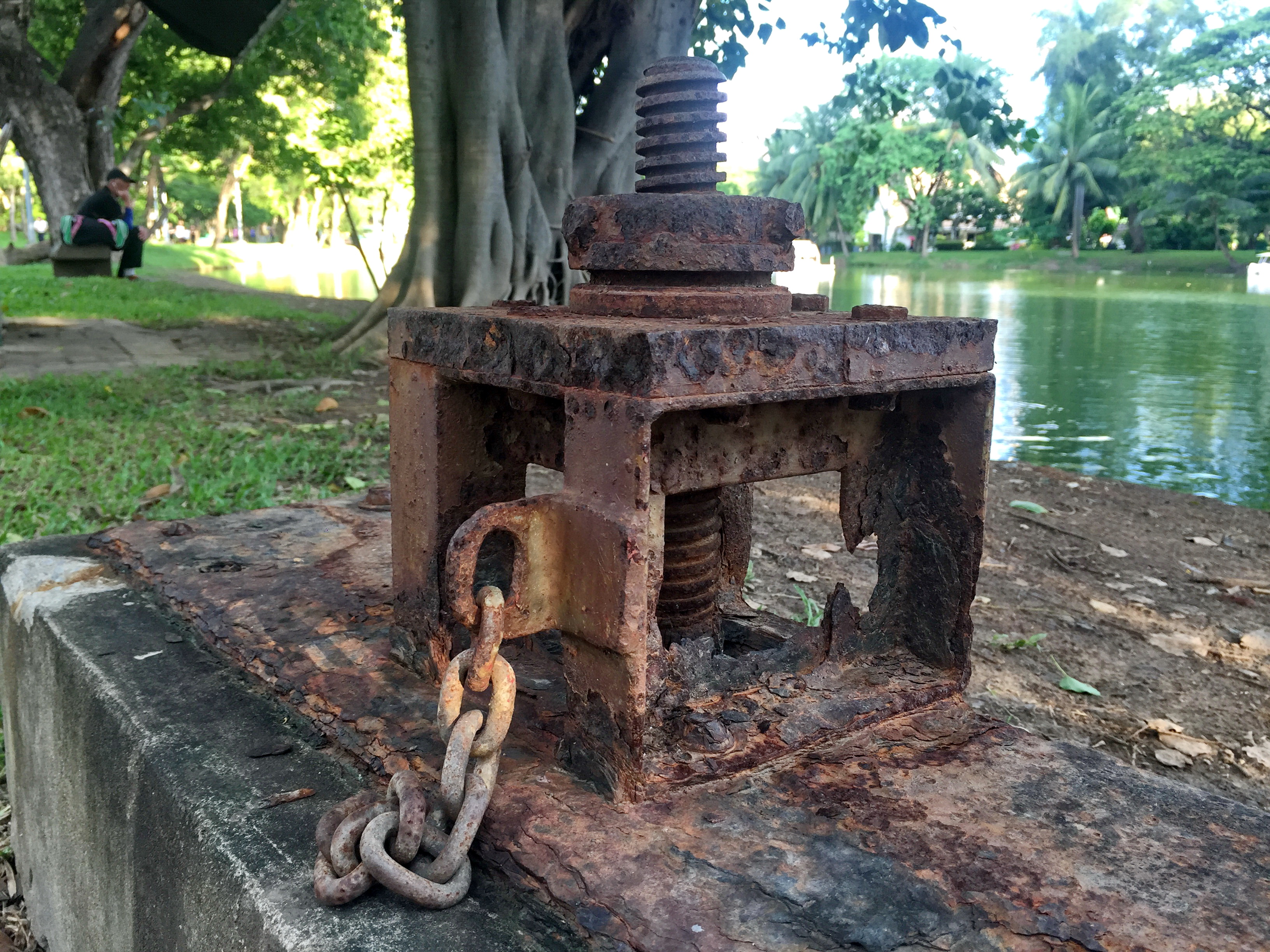 "I honestly was trying to make out what this rusted piece of contraption was i was told by some locals that this was like a flood gate that use to be open manually by placing a steel wheel over the threaded shaft and this would direct the waters into the lake in case of heavy flooding"