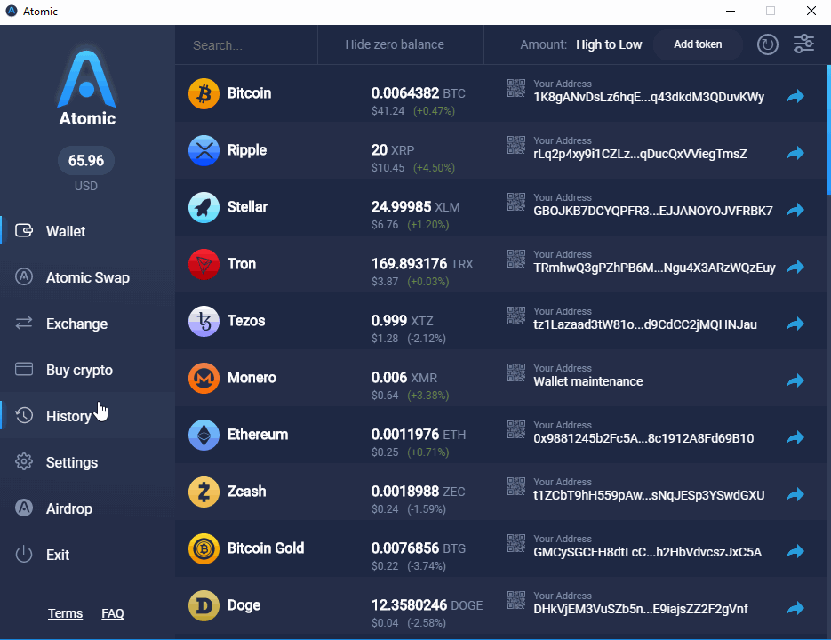 Anda dapat melihat saldo dompet cryptocurrency Anda, karena Wallet Atom terhubung untuk memblokir penjelajah. Ini seperti buku transaksi dengan seluruh riwayat blockchain. Ketika blok explorer menyinkronkan alamat Anda, saldo akan secara otomatis diperbarui dalam dompet cryptocurrency. Atom meminta blok penjelajah keseimbangan Anda. Jika block explorer menjawab saldo yang relevan Anda muncul di antarmuka dompet, dan Anda mendapatkan pembaruan otomatis yang ditunjukkan dalam USD). Catatan: Dalam beberapa kasus, mungkin diperlukan waktu beberapa menit karena jaringan kelebihan beban. Saldo USD Anda dihitung sesuai dengan tarif Coinmarketcap yang relevan.