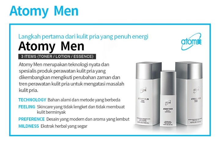Atomy Men spesialis untuk perawatan kulit pria yang dikembangkan Atomy mengikuti perkembangan perubahan zaman dan tren perawatan kulit pria.Mengandungi 3 jenis perawatan yang semuanya untuk pria sejati yang bergerak cergas setiap hari.