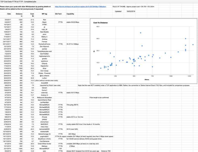 The Whirlpool Forums have been documenting the processes and costs involved in partaking in the Technology Choice Program since 2017. They have an excellent Google Sheets spreadsheet (pictured above) that you can view here which outlines the costs to upgrade to FTTH.