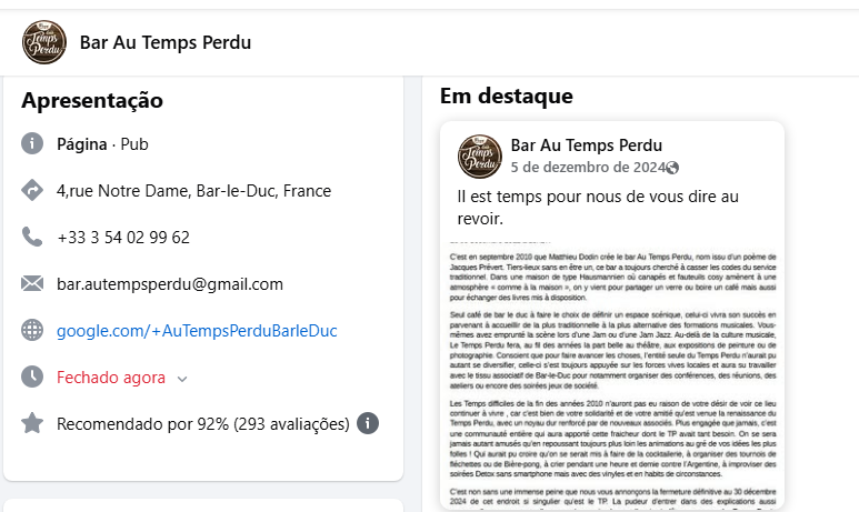 Une fois que j’ai trouvé le poème et que je me suis immédiatement souvenu de ces amis, j’ai pensé que j’irais les chercher, sur Facebook, et, pour plaisanter, leur envoyer le poème, parce qu'ils voulaient, peut-être, l'accrocher à un mur. Lorsque j’ai ouvert la page de médias sociaux respective, j’ai été choqué de découvrir que le Bar Au Temps Perdu a fini par fermer ses portes le dernier jour de l’année 2024. Une maison qui a survécu à la seconde guerre mondiale, n’a pas survécu au progrès et à l’évolution des habitudes de consommation. Je suis triste pour cela, mais je ne manque pas de vous laisser ici, le poème que j’ai écrit ce jour-là.