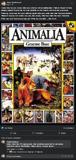 This was posted on Facebook (https://www.facebook.com/toddsthename) on July 12th 2021 with a picture of the cover of a book, Animalia by Graeme Base.