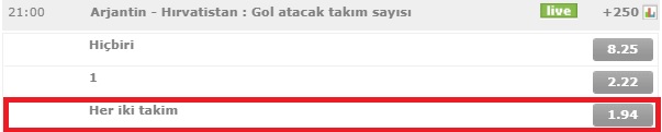 Is there anyone who does not feel sorry for Messi ? I do not know and I am really sorry :S Of course there is no word to say for Messi as a very very big footballer. He has already achieved lots of success. Come on Guys, Please allow him to win a World Cup. They will face a very tough competitor tomorrow. Croatians are really the top team both quality and discipline of the tournament. Nobody can deny it. People will try the bets that Messi Scores or Argentina Wins. But as i said I do not want to confront the Croatians. if everyone is ready :) I do not miss this tournament's favorite bet "Both Team to Score" by 1.94.