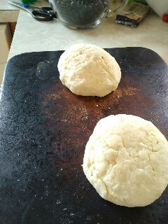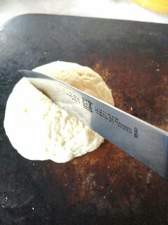 So then, once it's one ball, cut it in half and roll em out into two balls. Score the balls with two deep cuts. Set the Oven to 220ͦͦC, or 420 ͦ F and bake em for 25 minutes.
