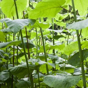 Syn. Polygonum cuspidatum, Reynoutria japonica. Belongs to the Polygonaceae family. Has the bamboo appearance of raised nodes with hollow stem structure. Considered a weed and invasive by many countries. It is on the world’s 100 worst invasive species and is definitely not bamboo.