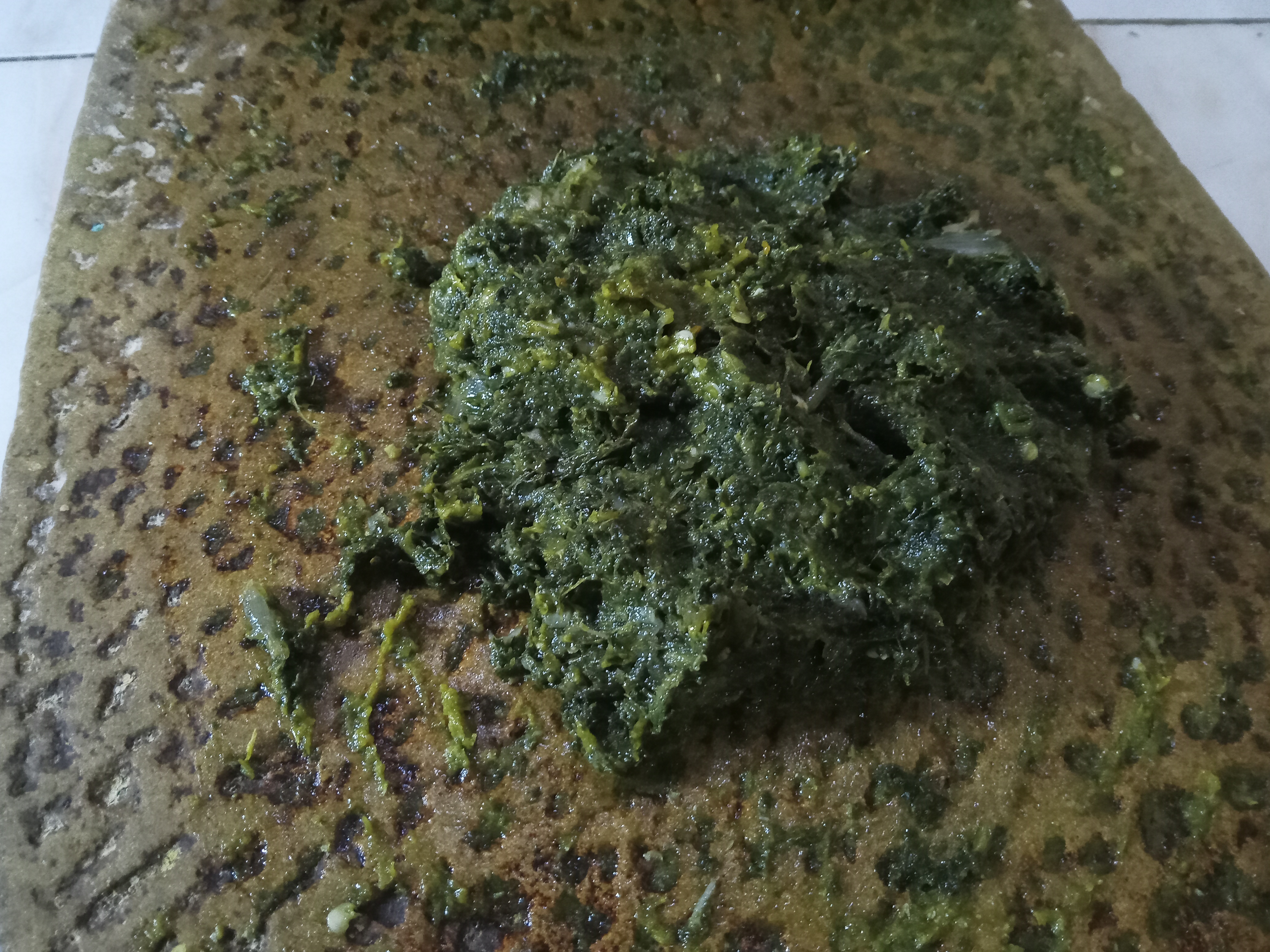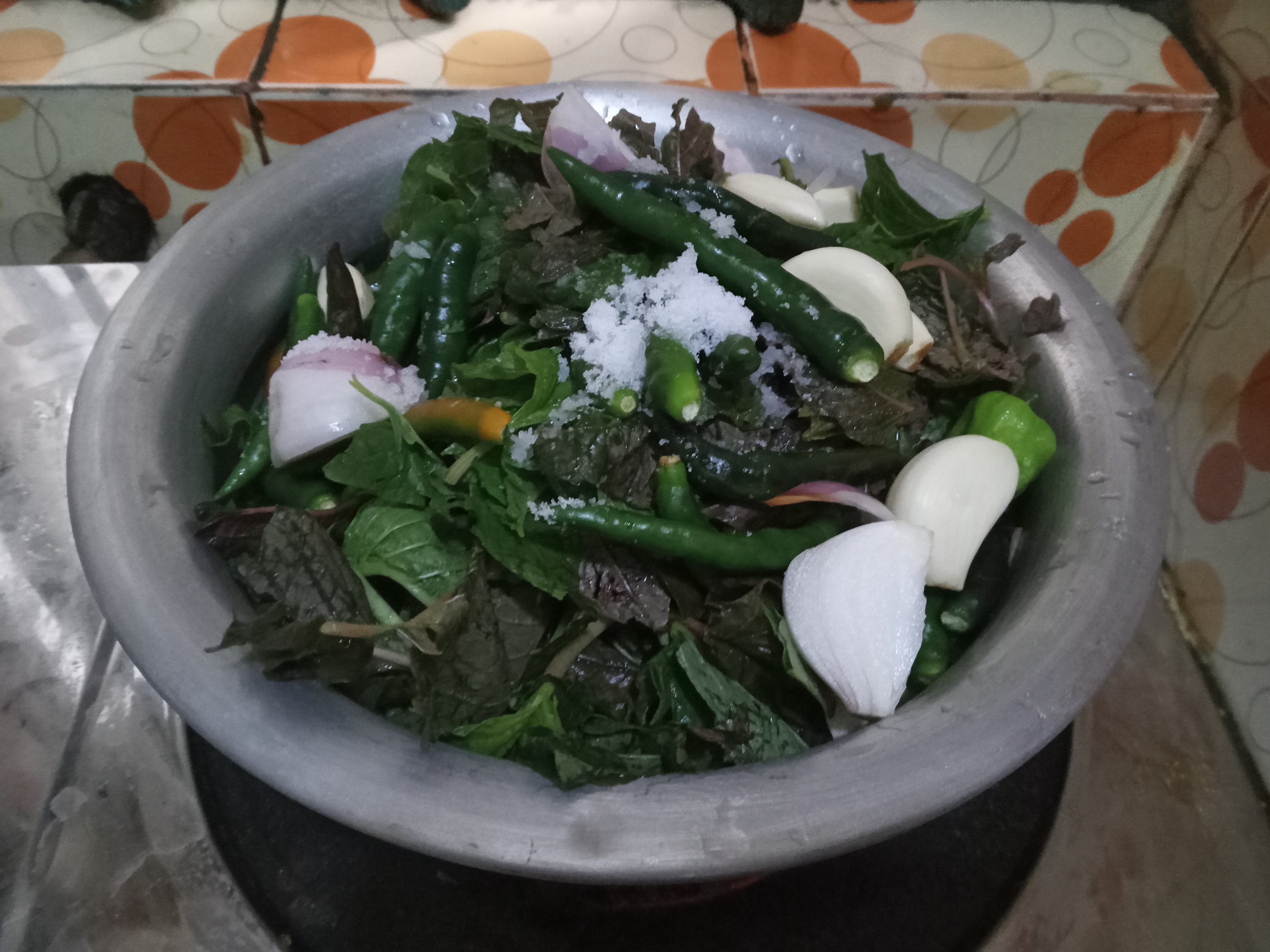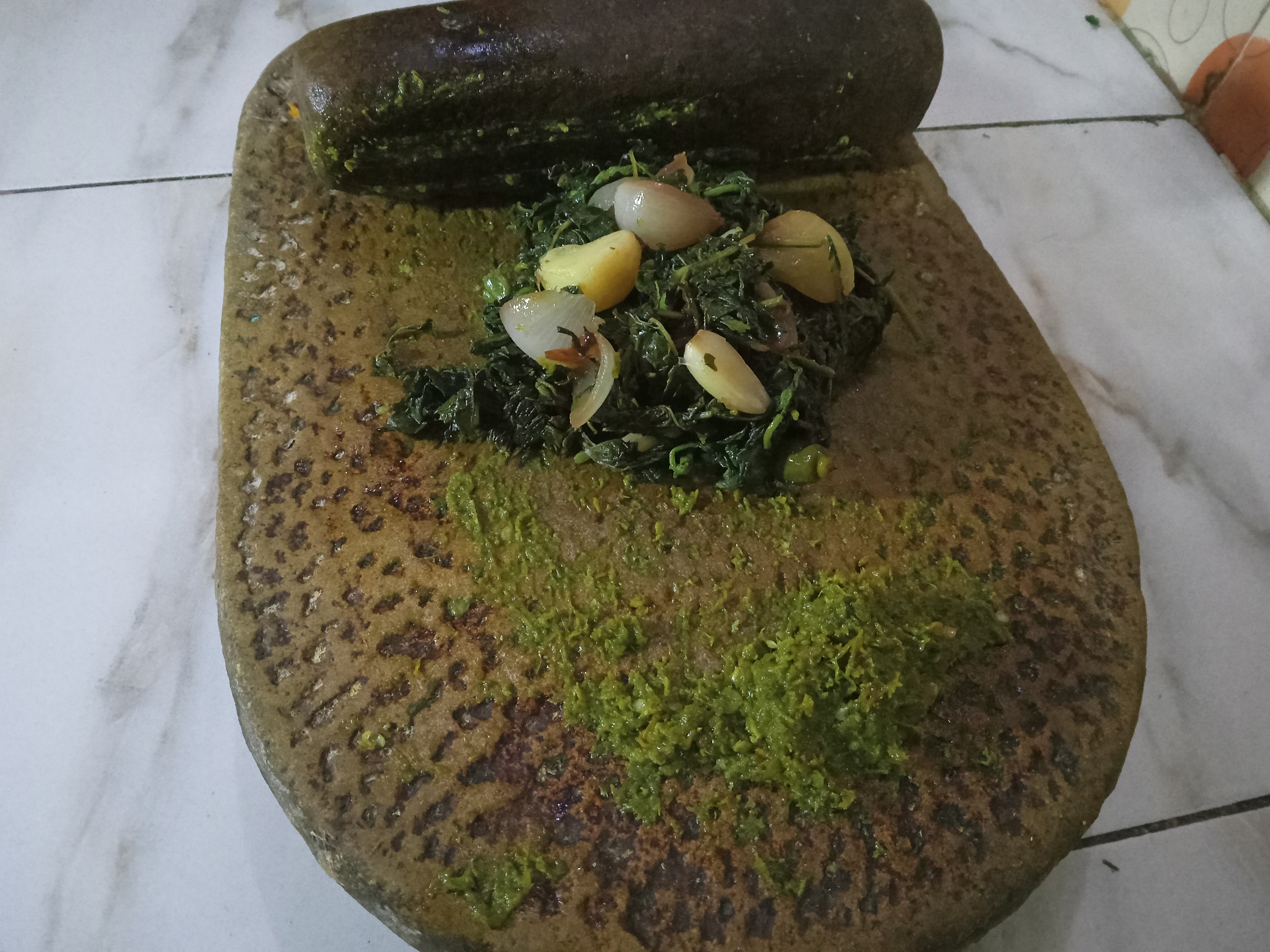 লক্ষ্য করুন, আমরা এইভাবে পাটায় বেটে ভর্তা তৈরী করি, এগুলো এখন প্রায় তৈরী হয়ে গেছে। একটু ভালো করে মিশ্রণ করতে হবে এখন।