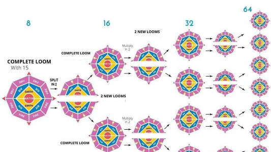 Once all 8 spots have been purchased, the loom splits into 2 new games, and you are now on one of the four green spots. 8 new players join, and after a 2nd split, you will be at one of the pink spots. After a third lot of 8 players has been recruited, you will have made it to the central spot.