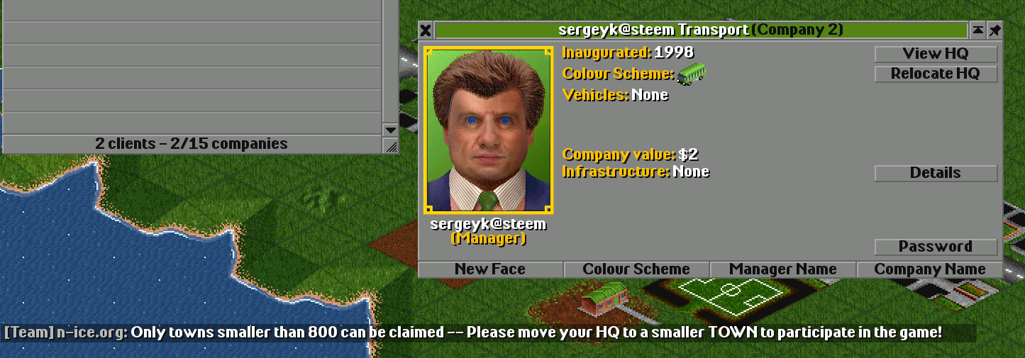 I created a new company, opened the list of towns, found one with less than 800 people, chose it, and placed my headquarters.