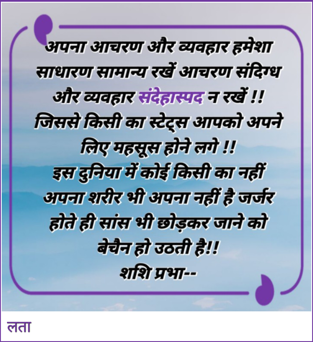 अपना आचरण और व्यवहार हमेशा साधारण सामान्य रखें आचरण संदिग्ध और व्यवहार संदेहास्पद न रखें !! जिससे किसी का स्टेट्स आपको अपने लिए महसूस होने लगे !!