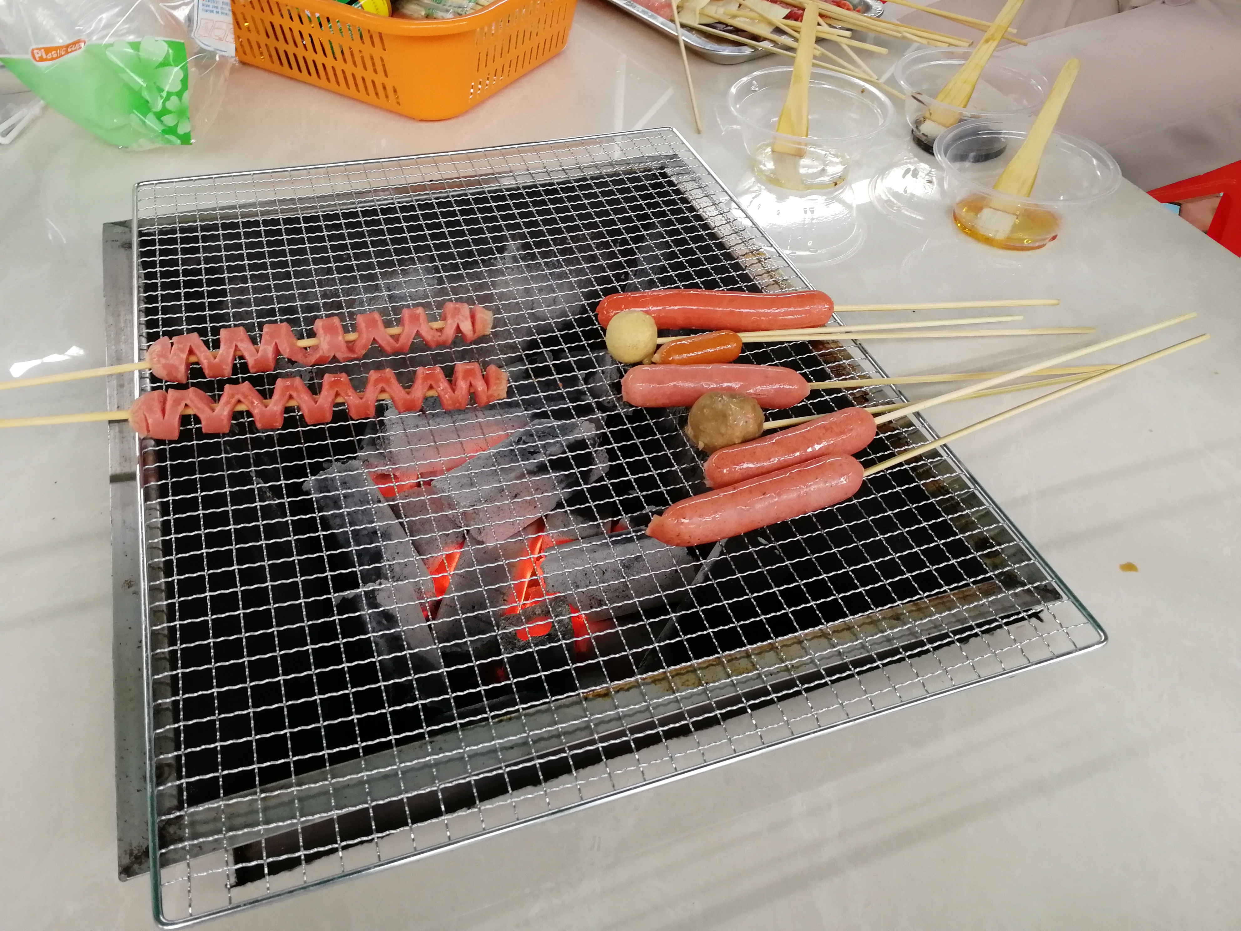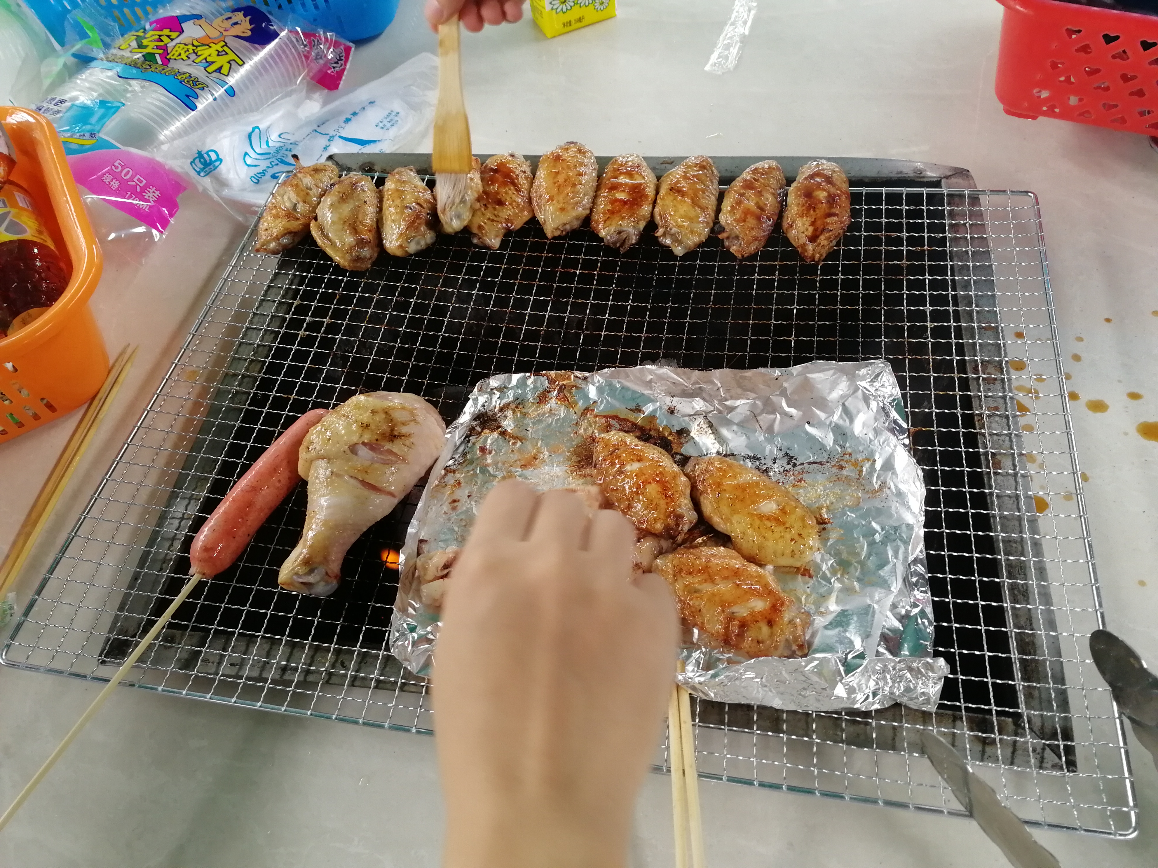 我坐在一旁等着吃,哈哈,因为我也不会烧烤,偶尔刷刷油,给鸡翅翻个身,最后在刷蜂蜜,烤出来,很美味的蜂蜜烤鸡翅哦!我们公司的人才真的多,好多人会烧烤的,烤得很棒,好好吃ヾ ^_^♪