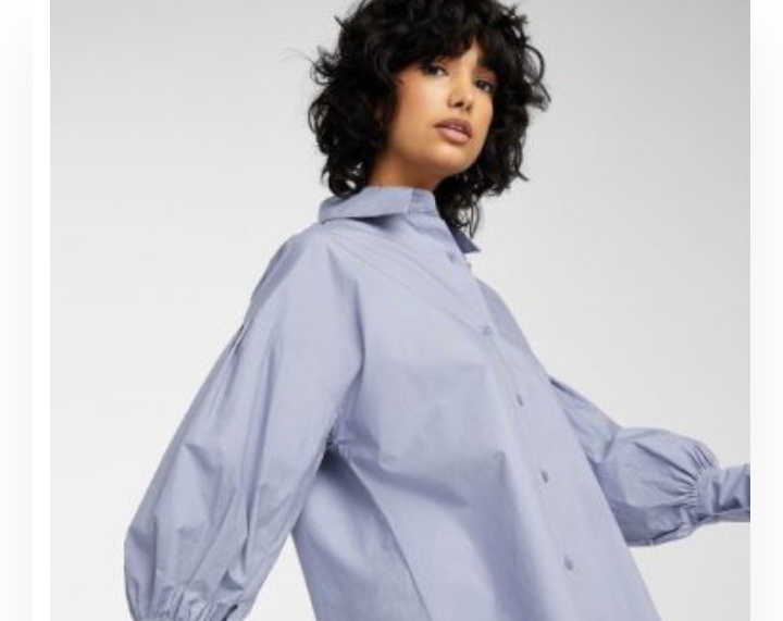 Cotton poplin shirt, Twik, $ 69. | Simons House | Its slate blue color is as versatile as you want, while its balloon sleeves add a modern touch to its otherwise classic allure: this cotton poplin blouse looks good all the way!