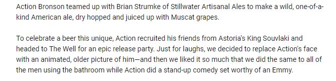 Action Bronson Made A Beer Stillwater 7000autonomysystem (51)in #beer • 8 years ago (edited)Action Bronson Made A Beer Stillwater 7000 Video below Has anyone tried this beer? #food #video #launch #wine