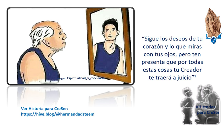 1.Mario un día se levantó y al mirarse al espejo vio al joven que fue 40 años atrás, este personaje fue famoso -dijo- logró ser el primero en la profesión de actor, le llovieron niñas hermosas que con el querían divertirse y tomarse fotos para fanfarronear con sus amigas. Gano abundante dinero, y todo lo compartió con un sin número de mujeres que sólo buscaban el placer del joven rico. Hoy vive de empacar mercados en un súper, y las propinas de los clientes lo sostienen. Abrió una biblia olvidada por un cliente y leyó: “Alégrate joven en tu juventud; que tu corazón te lleve al disfrute en los días de tu juventud. Sigue los deseos de tu corazón y lo que miras con tus ojos, pero ten presente que por todas estas cosas tu Creador te traerá a juicio”¹