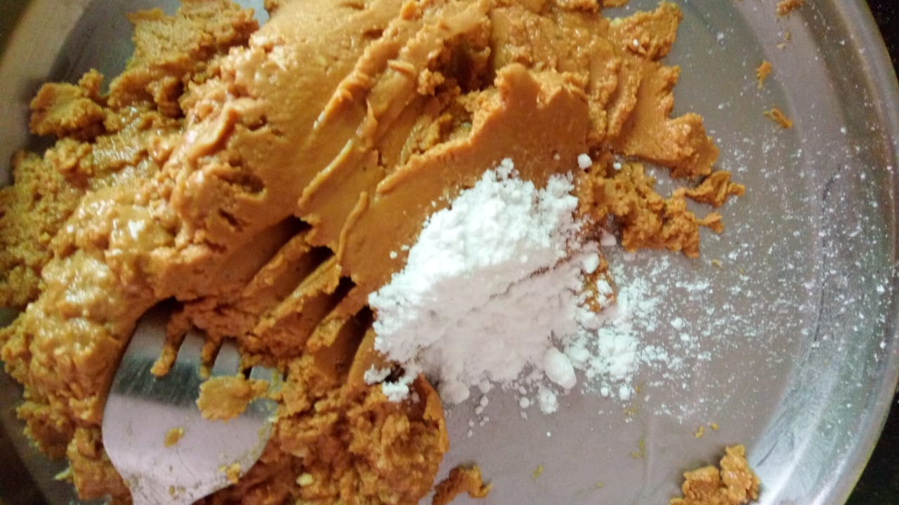 once the besan is slurry as seen in the pic turn off the gas and transfer the besan in a dry plate and add sugar and cardamom