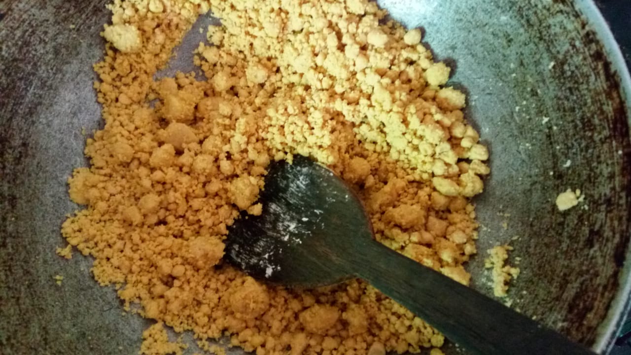 Roast the besan flour in the ghee till whole house is full of aroma and the besan turns brown and slurry.