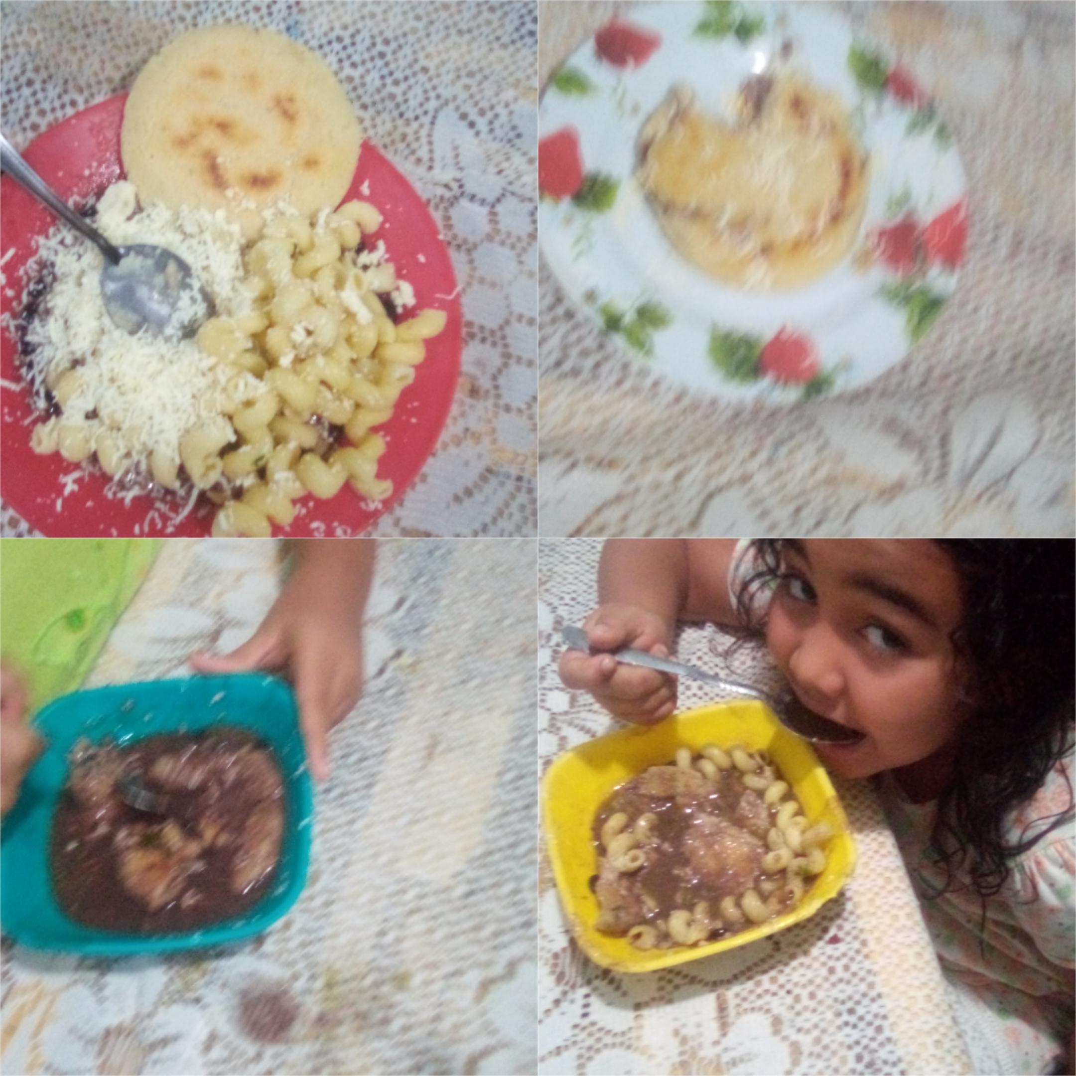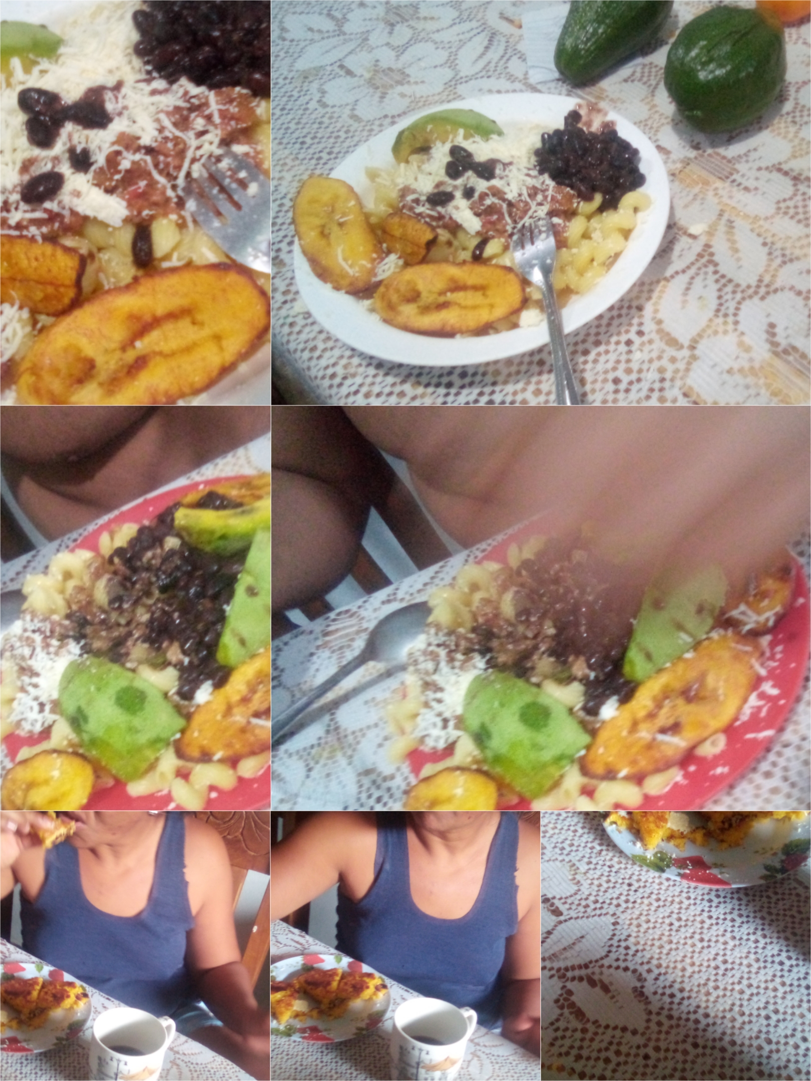 Elaboré unas ricas pasta corta con carne molida, tajadas, caraotas ,queso, salsa ,aguacate, jugo de naranja serví a mis niñas esposo y yo buen apetito!
