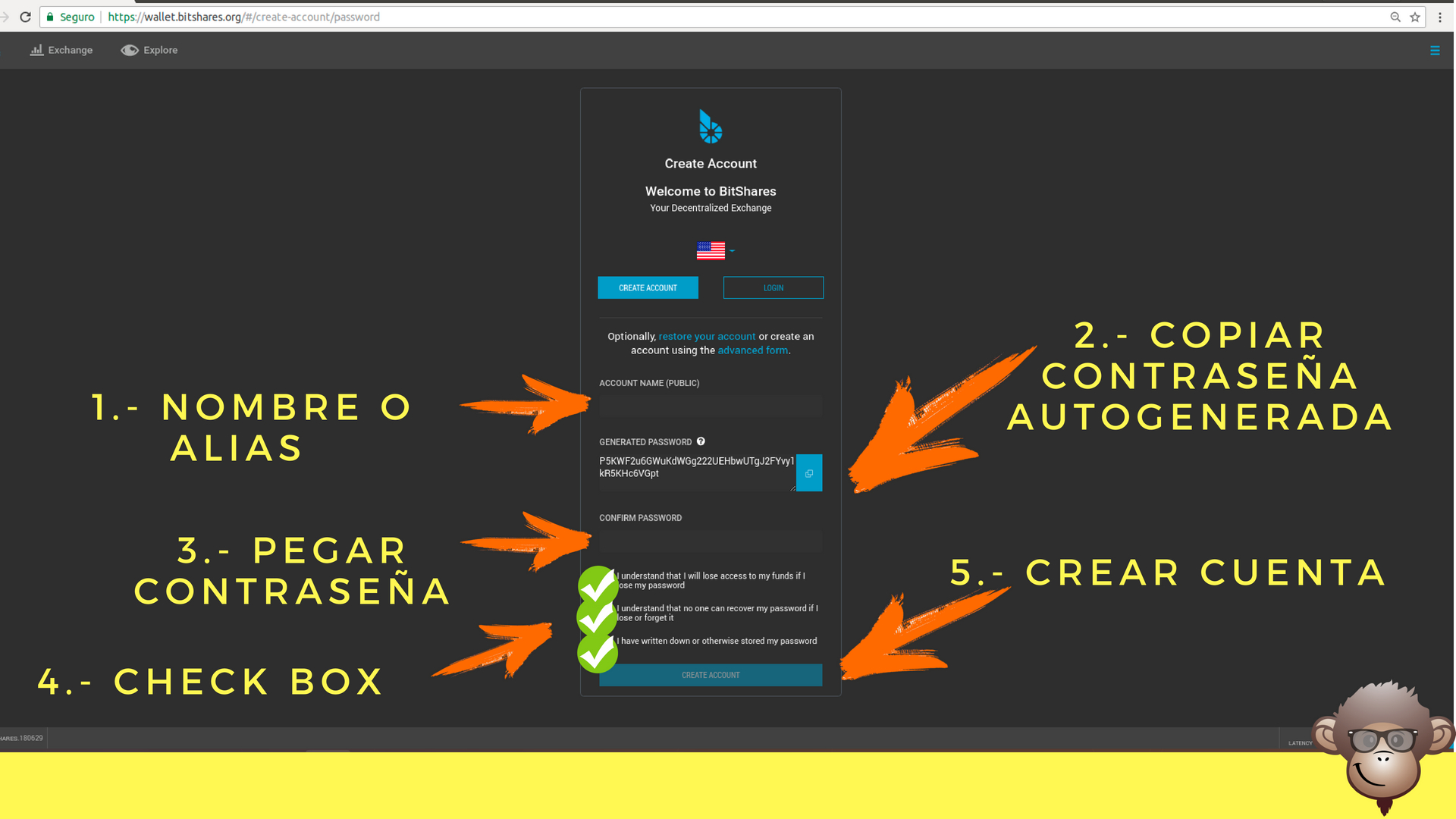 Nota: Es Importante guardar la clave autogenerada antes de crear la cuenta y mantenerla muy segura. Tú eres el responsable de la seguridad de tu cuenta Bitshares.