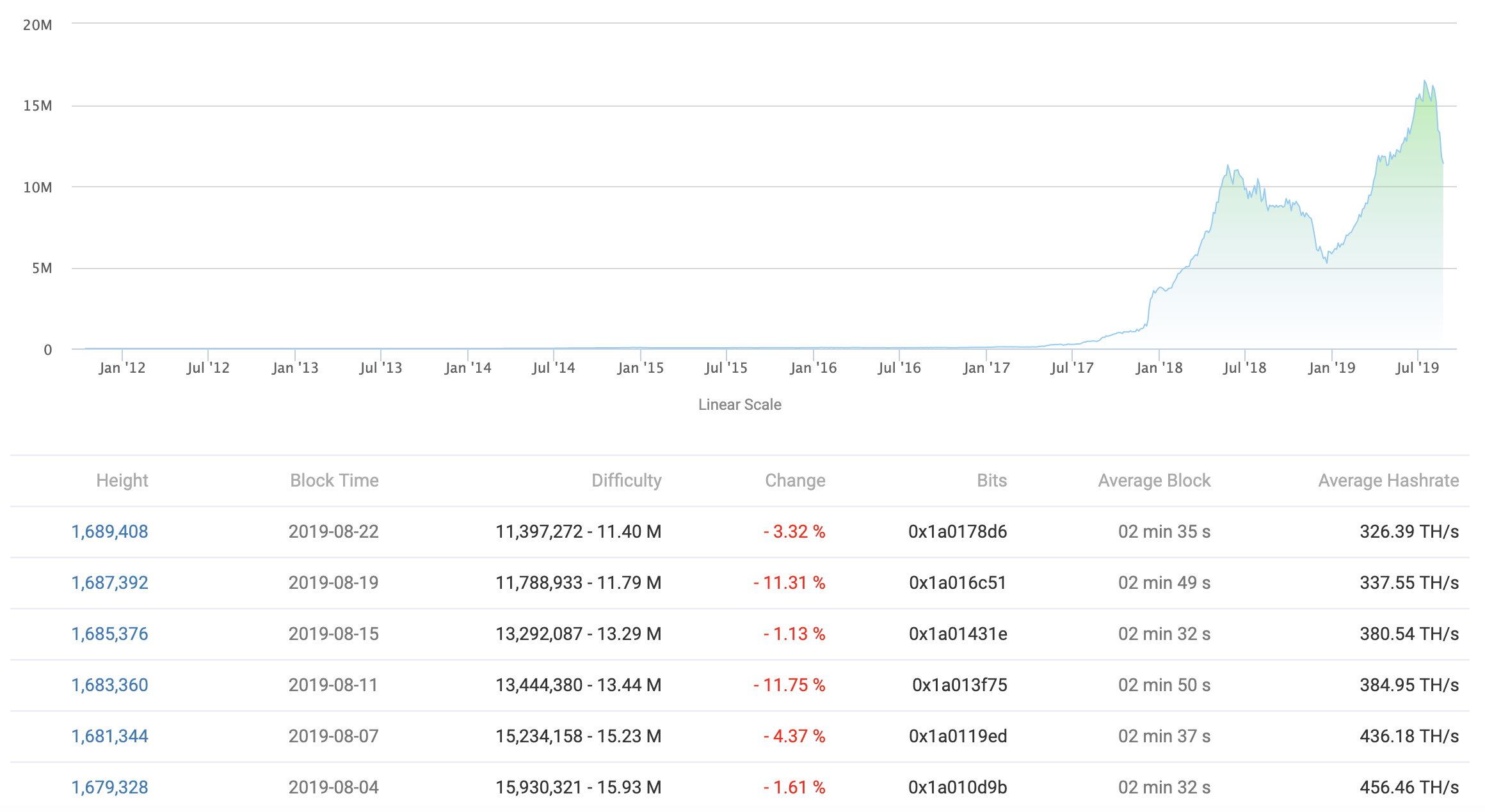 The 4-day average hashing power on the litecoin network has conjointly declined from 456 terahash per second (TH/s) recorded on August. four to 326 TH/s on August. twenty two at 23:54 Greenwich Mean Time, once the newest problem adjustment occurred – a twenty eight % drop.
