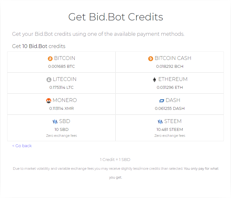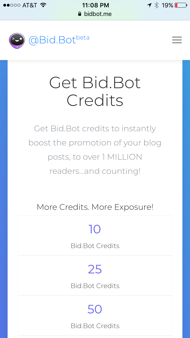 At Bid.bot you purchase "credits" and use those credits to obtain your Upvotes.