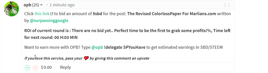 | @opb | !vote, !delegate, !bid, !status | post,reply | 5sbd, 5steem | |