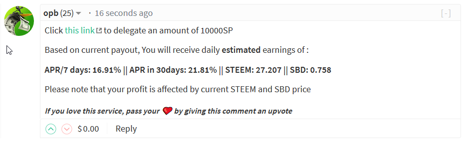 Profits of delegation now increased with weekly powerdown of 18 steem to increase the payout of all delegators. This is to thank for your support and increase the SP pool of onlyprofitbot. Right now 7 days apr is reaching 17%. and 30 days apr of 22%. Enjoy your new profits, which you should notice on your yesterday payout.