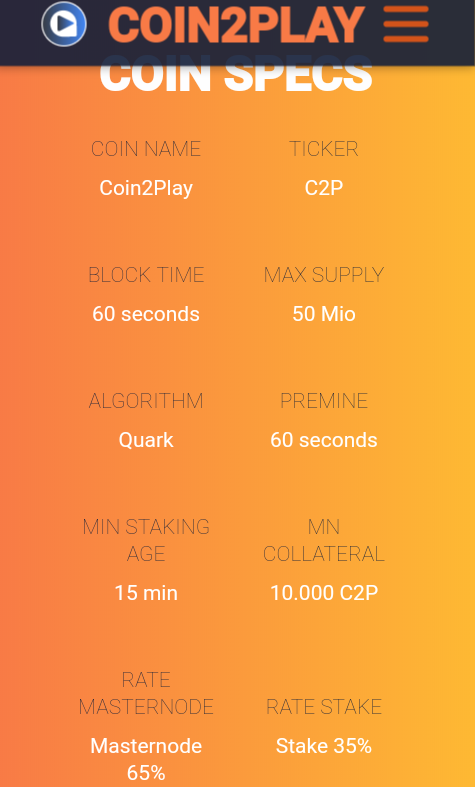 Coin2Play, really is a sparkling gem in the world of cryptocurrency, do you know that the coin actually gives a high reward of 65% to masternode owners? That is the more reason you should get actively involved in this crypto project, check out the coin specifications below