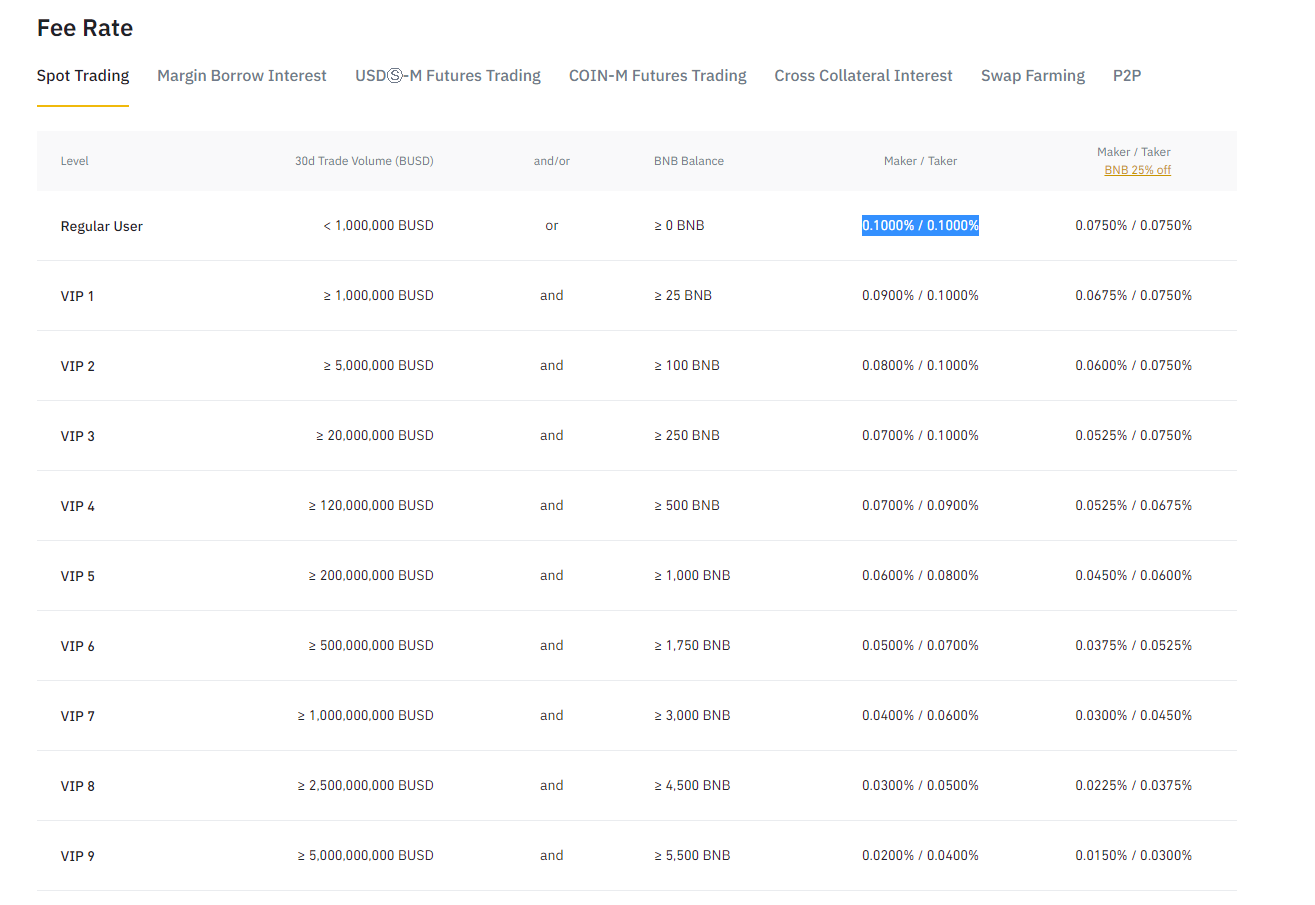 - Very low exchange fees regular user maker/taker(0.1000% / 0.1000%) and 25% if BNB as payment