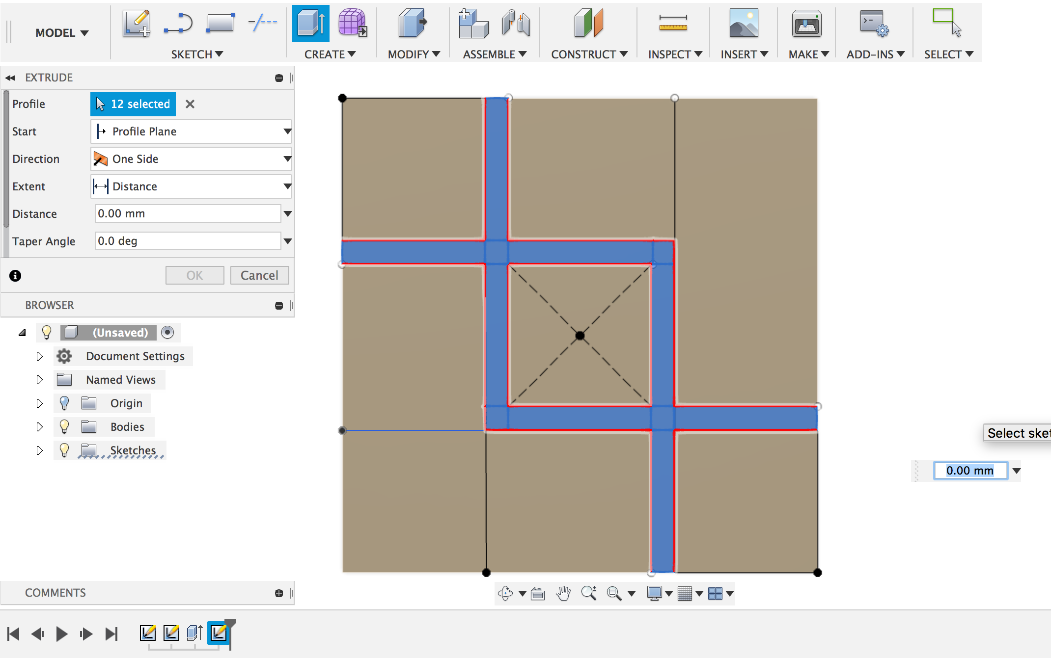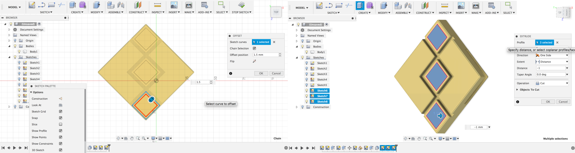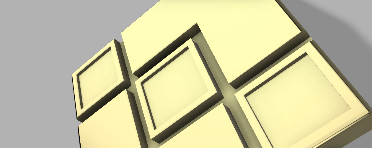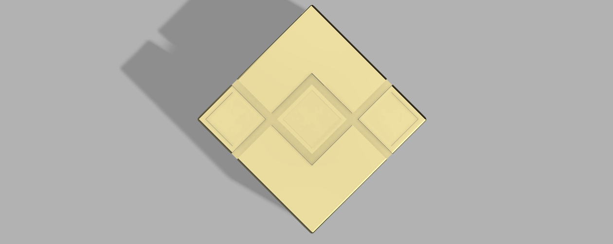First I sketched a rectangle of 60 mm by 60 mm. Later on, I sketched three rectangles of 18 mm by 18 mm and offset all three rectangles with 3 mm which creates a frame around all three rectangles, a sort of herringbone pattern.