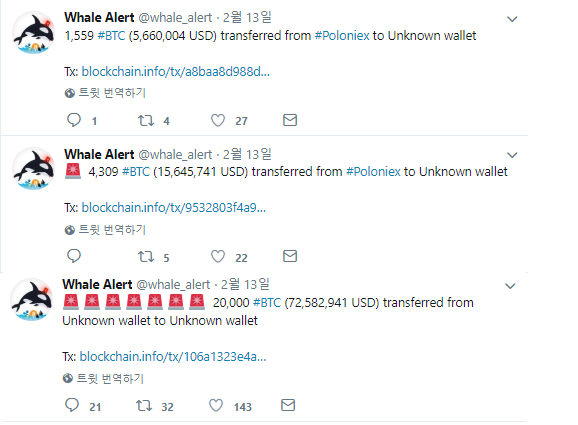 2019년 2월 13일에 총 25,868개의 비트코인이 이동하였는데요~~~~