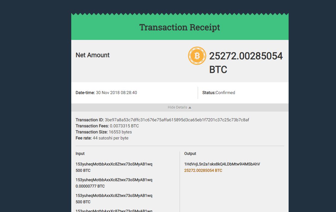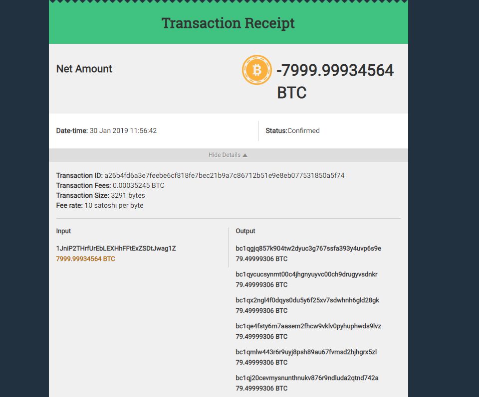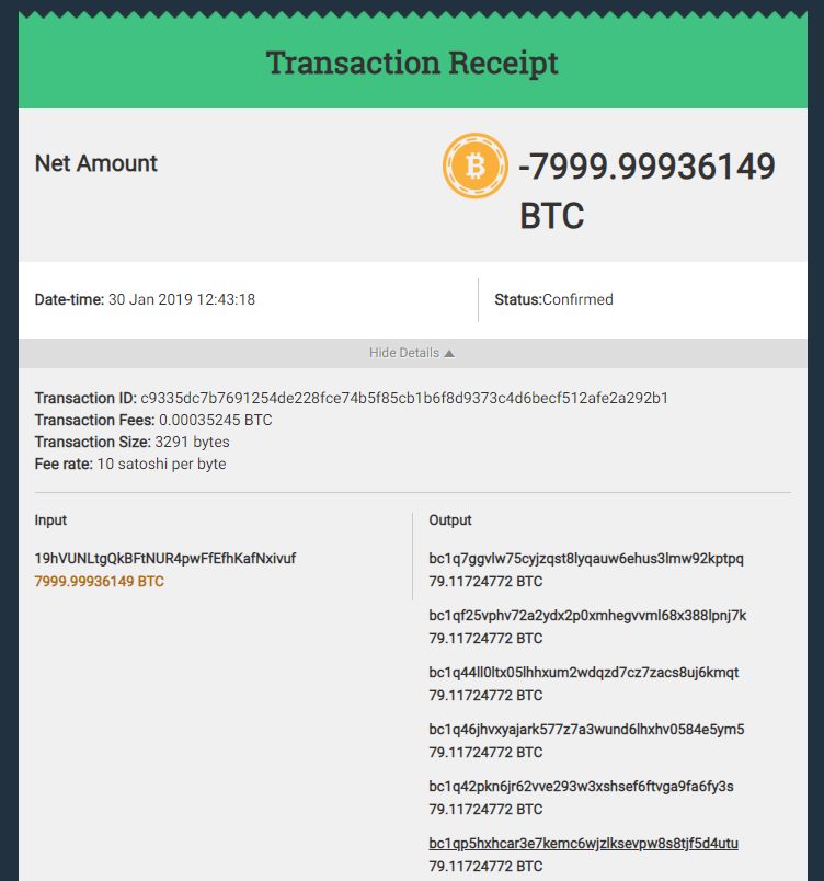 드디어 종착지에서는 7,999 BTC 를 100개의 지갑에 동등하게 나누어서 보관하는 모습을 보였습니다!!