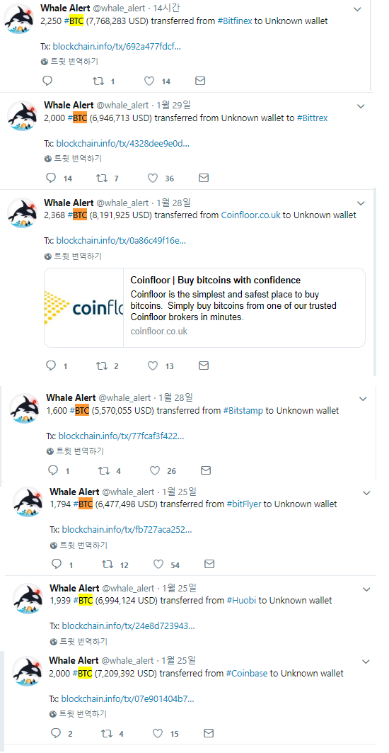 1월 25일부터 오늘까지 비트코인이 몇 천 개씩 거래소에서 지갑, 지갑에서 거래소로 계속 이체되고 있었습니다!!