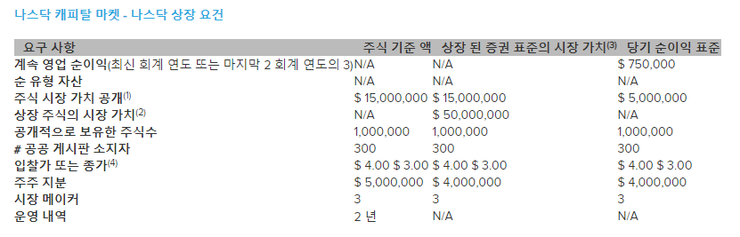 나스닥 상장에는 다음과 같은 요건이 있는데요~~
