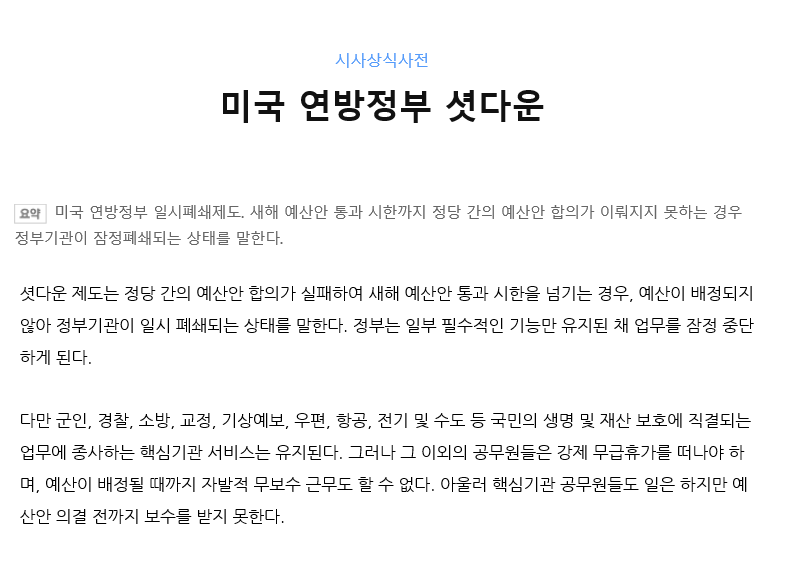 미국 연방 정부의 정당간 예산안 합의가 실패하여 정부기관이 파업하는 현상을 뜻하는 것인데요~~