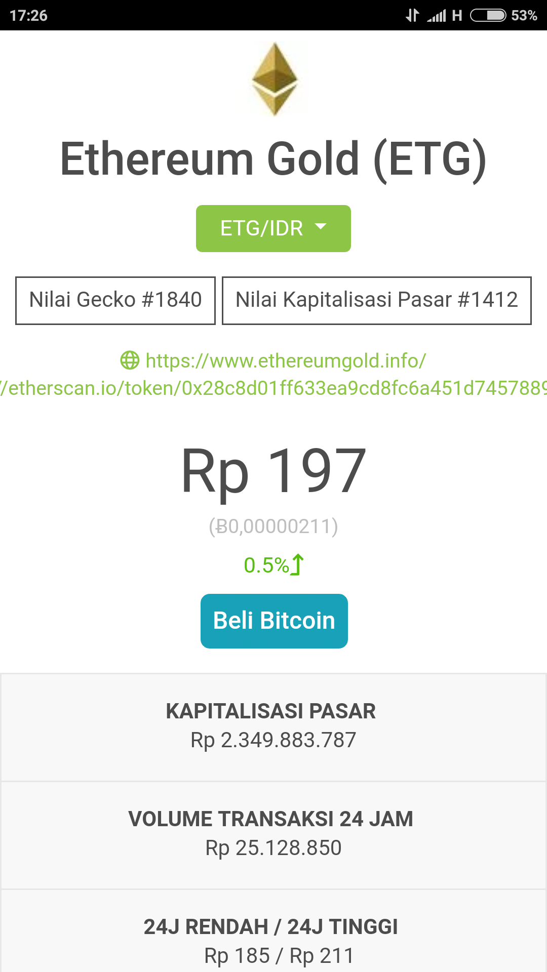 Ethereum Gold Chartapalambak (39)in #bitcoin • 8 years ago Ethereum Gold Grafik Harga Indonesian Rupiah (ETG/IDR) Harga Ethereum Gold untuk hari ini adalah Rp 197. Suplai yang beredar terkini adalah 12 Juta koin dan total volume yang telah mengalami pertukaran Rp25.127.258 #crypto #cryptocurrency #whalepower #steemit