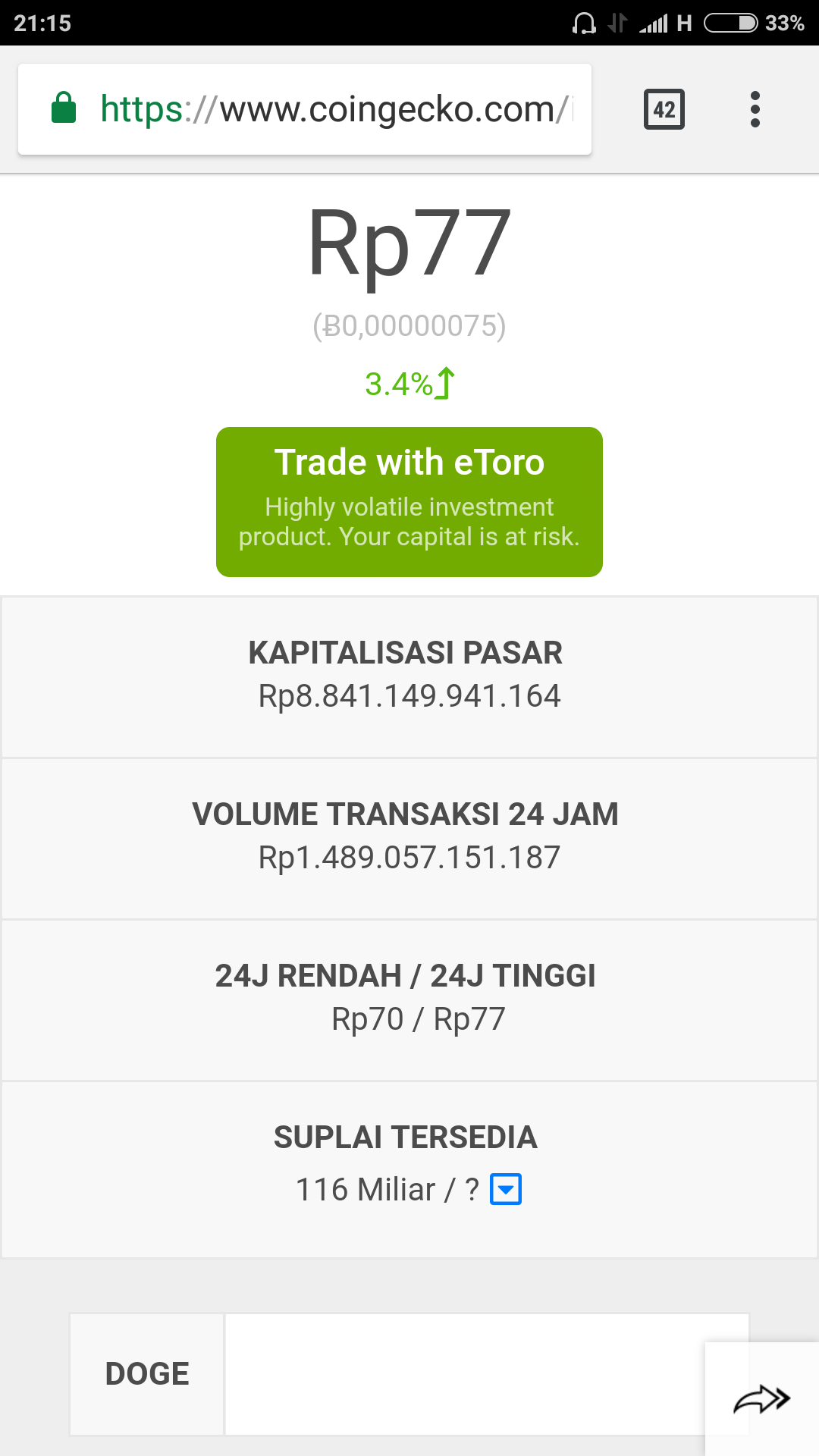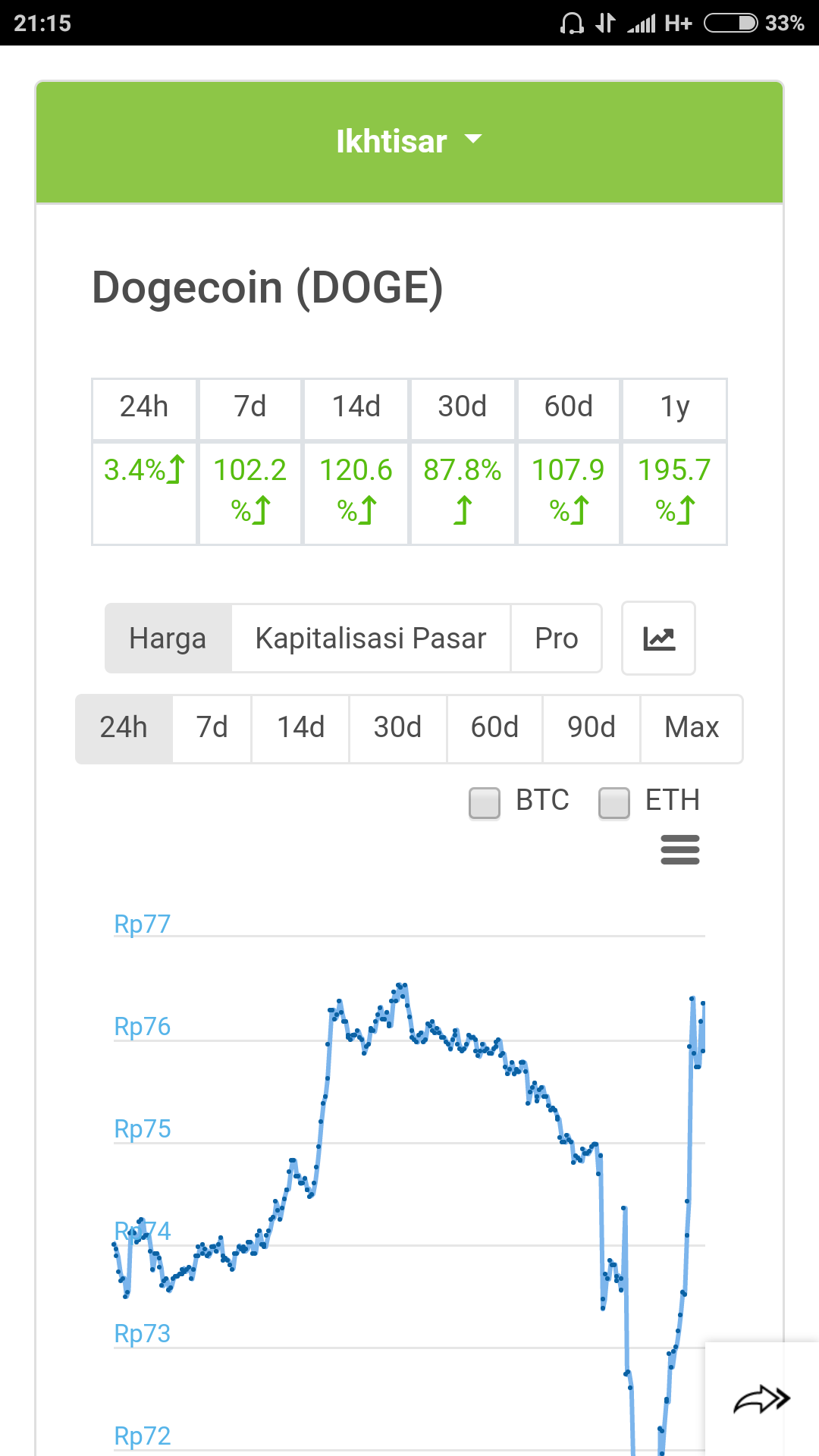 Harga Dogecoin untuk hari ini adalah Rp77. Suplai yang beredar terkini adalah 116 Miliar koin dan total volume yang telah mengalami pertukaran Rp1.490.190.383.832
