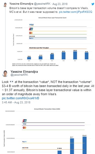 According to cryptocurrency analyst Yassine Elmandjra, who works at New York-based investment firm ARK Invest, too many people are focused on the number of transactions Bitcoin handles each year, instead of looking at the actual dollar amount.