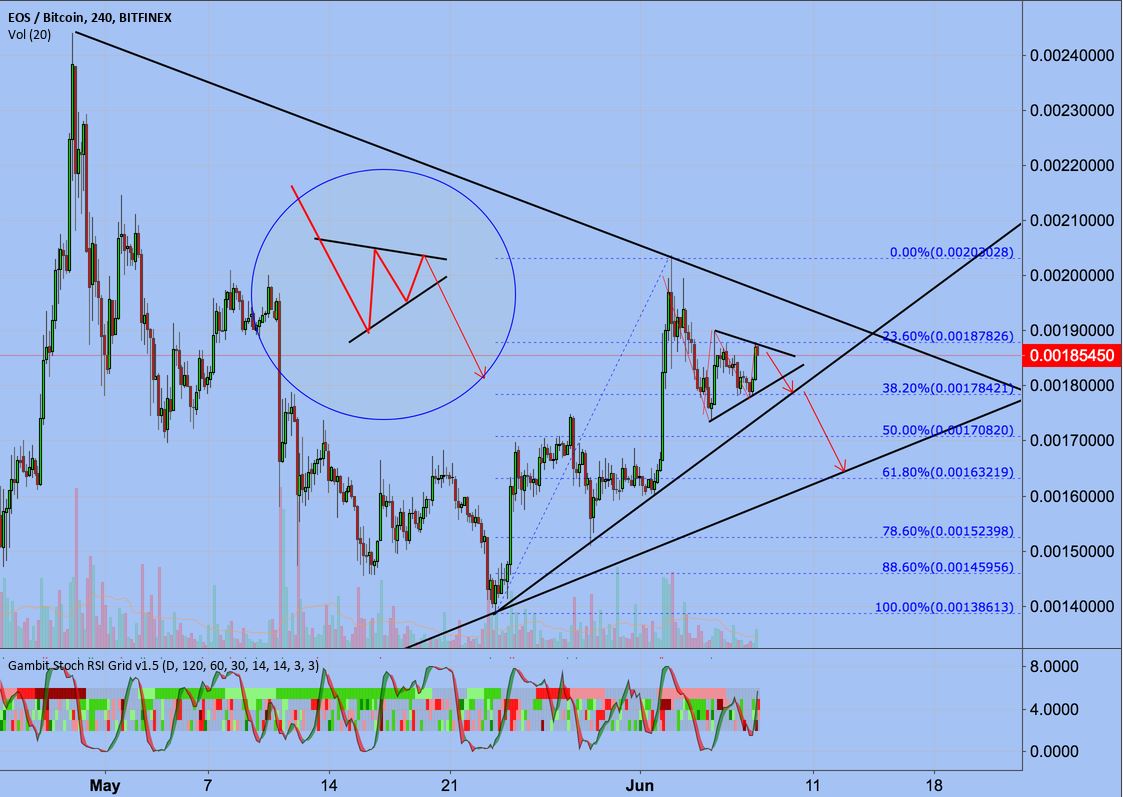 EOSBTC -2.12% moving in a triangle, touched resistance line of this triangle and go to the support line. Also, I see the second cycle. Stochastic RSI - overbought.