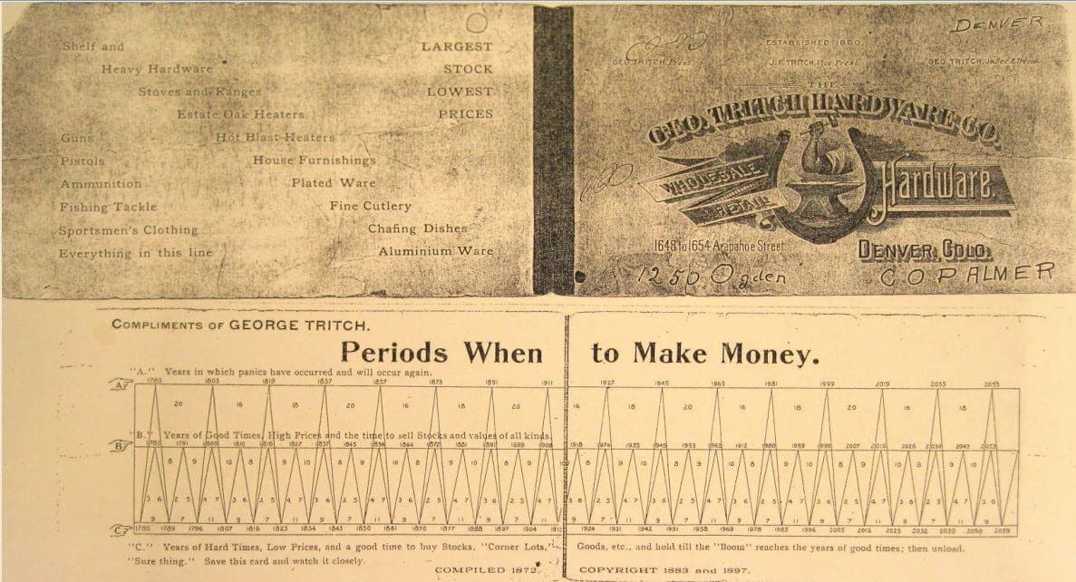 It is well known that our economic boom and bust cycle usually takes 8-10 years to complete. The pamphlet above circa 1897 proves as much as it accurately shows the 2008 collapse (take a look at where 2019 is).