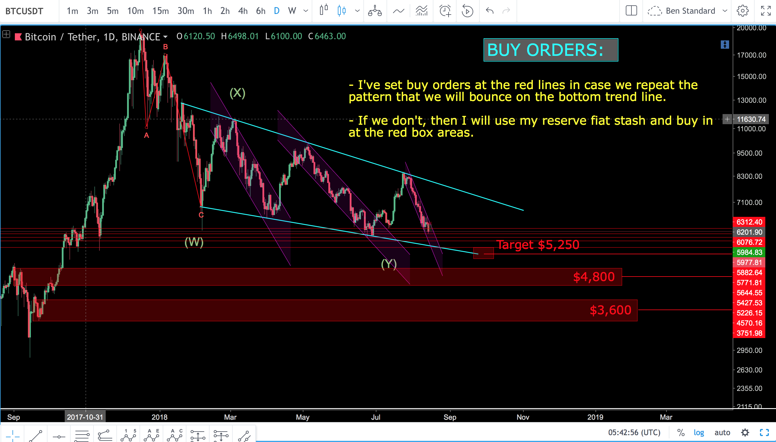 - I've set buy orders at the red lines in case we repeat the pattern that we will bounce on the bottom trend line.