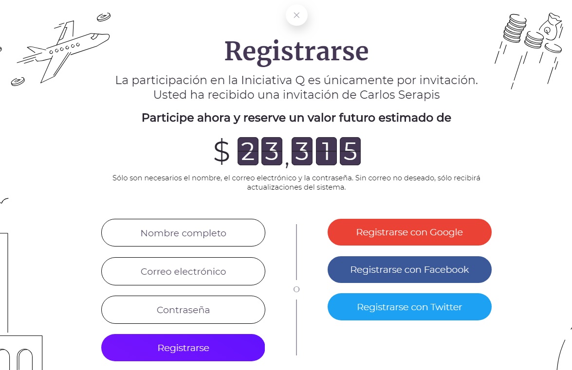 La Iniciativa Q es un intento de ex empleados de PayPal para crear un nuevo sistema de pago en lugar de las tarjetas de crédito que se diseñaron en la década de 1950. El sistema utiliza su propia moneda, la Q, y para que las personas comiencen a utilizar el sistema una vez que esté listo, se están asignando Q de forma gratuita a las personas que se inscriban ahora (la cantidad disminuye a medida que se incorporan más personas, así que es mejor inscribirse temprano). Inscribirse es gratis y solamente te pedirán tu nombre y una dirección de correo electrónico. No hay nada que perder, pero si este sistema de pago se convierte en un método de pago líder en el mundo, tus Q pueden valer mucho. Si te perdiste la oportunidad de obtener bitcoin hace siete años, no te querrás perder esto.