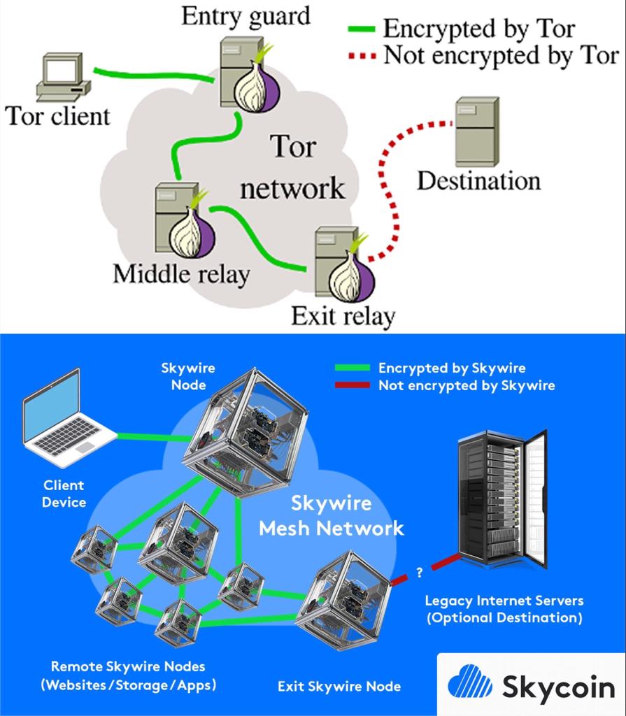 The operator can never grasp any information about the transit traffic, and the receiver of the traffic cannot recognize the operator of the network access point. And, by adding mandatory hops (a “guard node”), ISPs cannot easily identify Skycoin Darknet traffic from a particular public access node relayed through a particular cable modem.