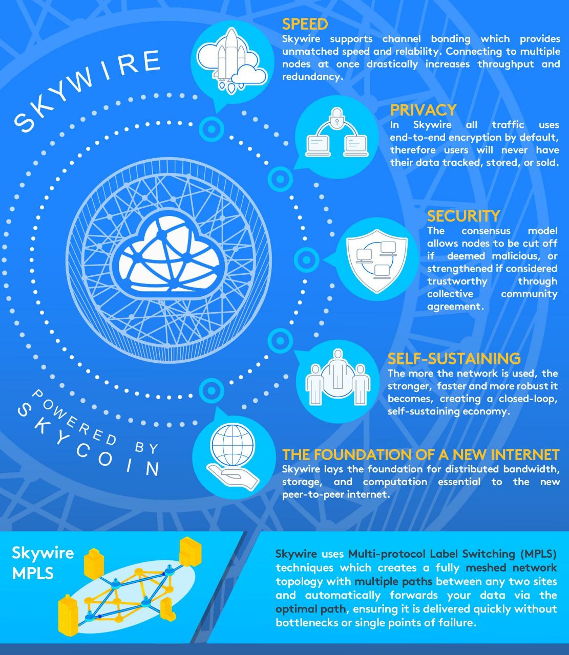 The Skywire communication protocol uses Multi-protocol Label Switching (MPLS), rather than TCP/IP, to enable highly scalable and high-performance transport of any data across any medium. With MPLS, routes through the network are determined prior to sending traffic.