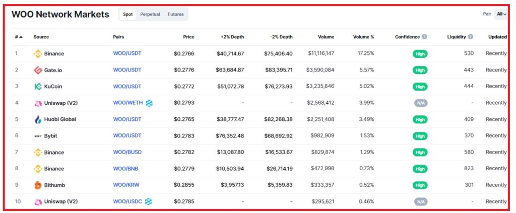 Here, you can see each exchange that is currently trading the coin or token as well as other useful metrics such as price and volume.