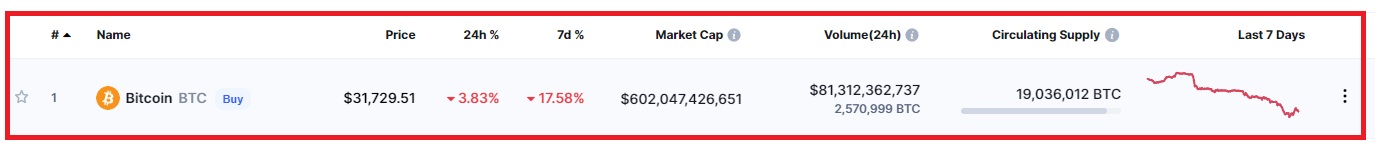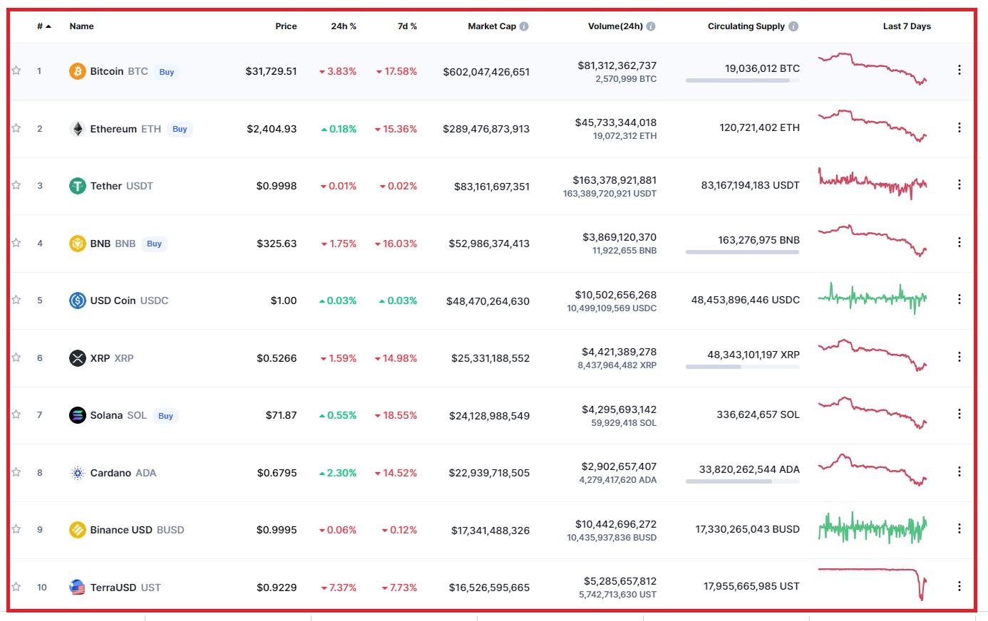 Now we are getting to the good stuff. Here, you will find all the cryptocurrency coins and tokens listed in order from 1 to 19388 (at the time of writing) as per their market capitalization. We’ll go into more details on this in just a moment, but you will notice Bitcoin (BTC) is number one followed by Ethereum (ETH).\