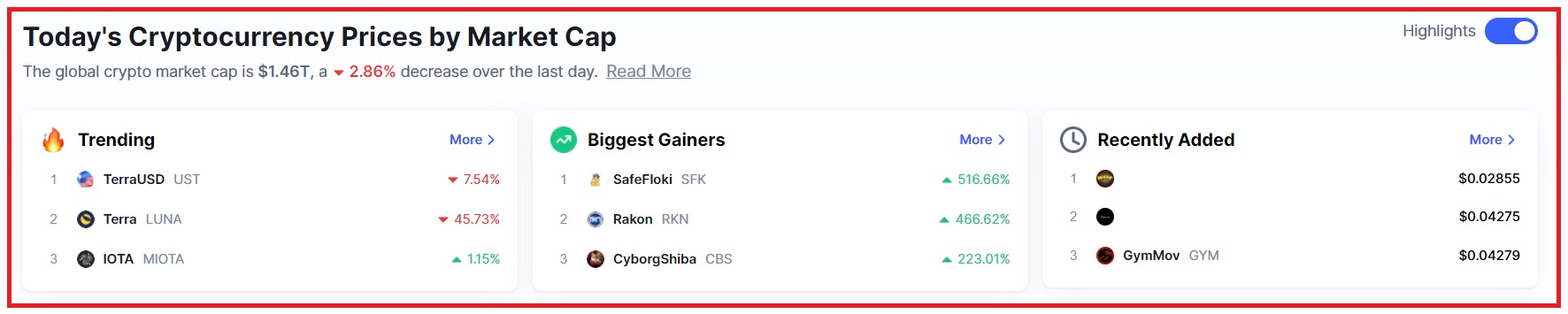 In the Highlights section you will find some timely data related to what is happening right now within the markets. Firstly TRENDING will show you the coins which people are searching for on the site. This is a good indicator for sentiment. Next, you will see the BIGGEST GAINERS and this will show the cryptocurrencies with over US$50,000 trading volume which have gained the most in the last twenty-four hours. If you click on the link you will also be taken to a page to see the BIGGEST LOSERS. Finally, you will see a column for RECENTLY ADDED coins & tokens, this can be very useful if you are looking to get in early on a project.
