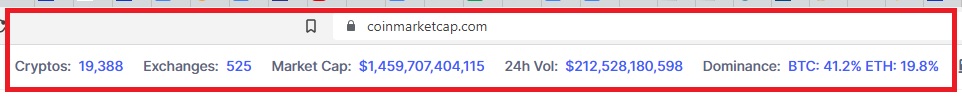 At the top of the page you will find some useful data reflecting the current state of the crypto market. Here you will find the total number of cryptocurrency coins/tokens (as tracked by CMC), the total number of cryptocurrency exchanges, the total marketcap of the entire cryptocurrency industry (we will talk more about marketcap later), the 24 hour trading volume recorded across all exchanges, and the dominance or market share of the two biggest cryptocurrencies – in this case Bitcoin (BTC) and Ethereum (ETH).