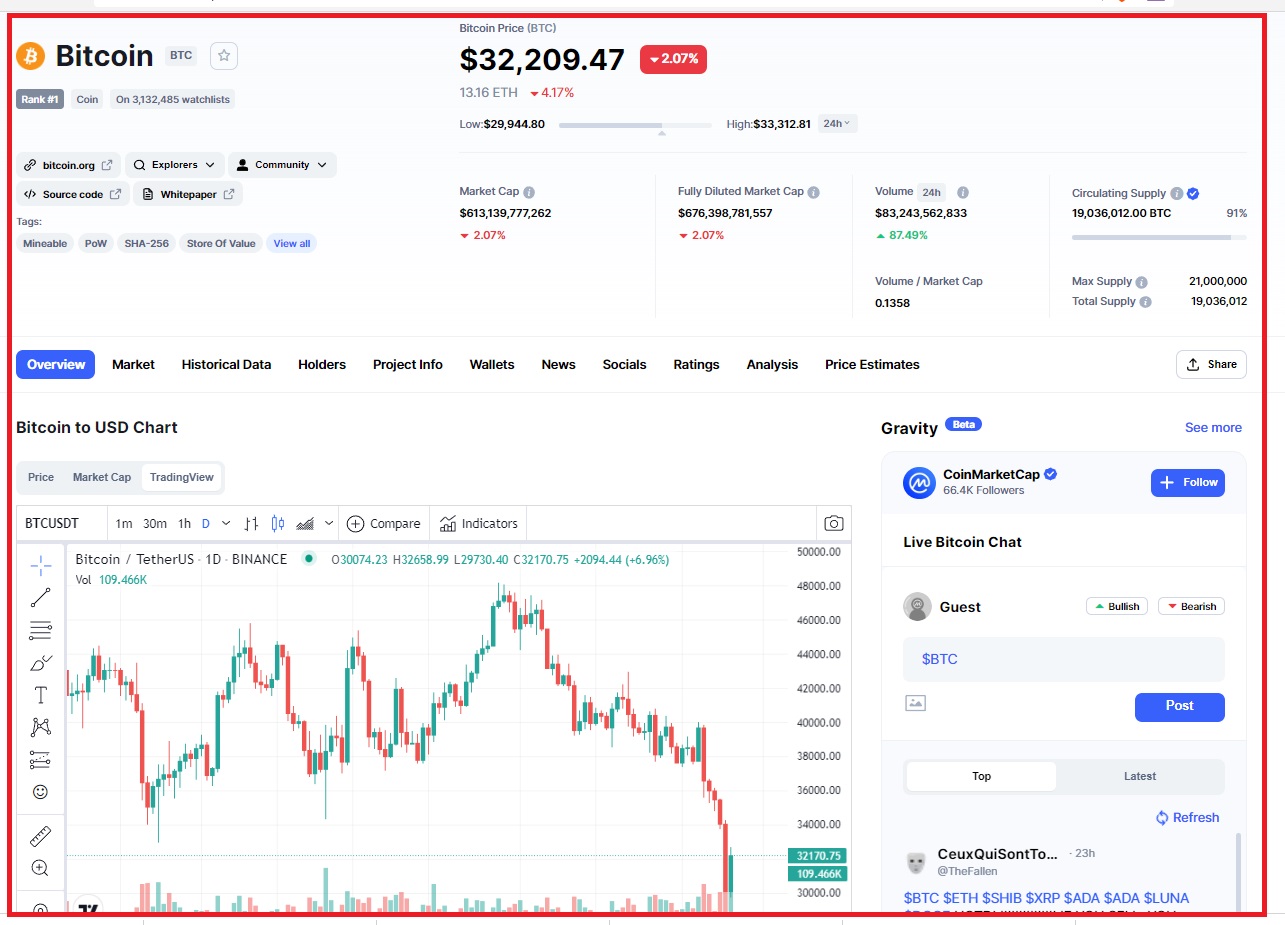 If you CLICK on any coin on the homepage of COINMARKETCAP, then you will get taken to another dedicated page to that particular cryptocurrency. Here you will see some of the same information as mentioned previously, but also some great links to continue your research further. Firstly, towards the top left of the page you will see the official link to the project’s website, block explorer, source code and the whitepaper. This accurate information is often difficult to find with a simple google search due to the amounts of scammers providing false phishing links. You can be assured that the information on COINMARKETCAP will take you to the right place. Next to Overview, you will see a tab titled MARKET, if you want to know where a cryptocurrency is trading and what price and trading pairs, then this tab is very useful, particularly for smaller or new projects.