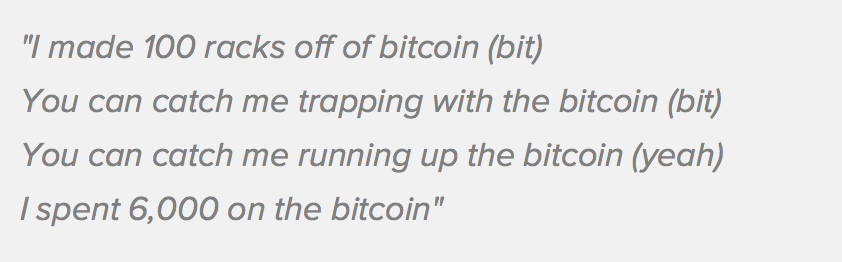 I find this absolutely hysterical. In the song he brags about spending "$6,000 on a Bitcoin". He follows that verse by saying "you can catch me trapping with a Bitcoin, you can catch me running up a Bitcoin". Wow, well if this doesn't just bump on your speakers I don't know what will: